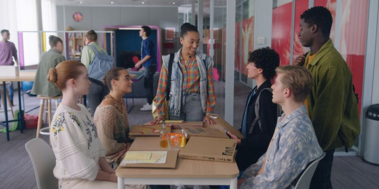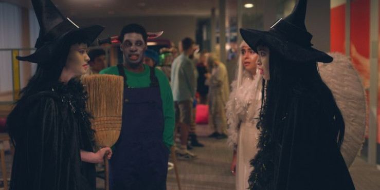 Cece (Hailey Romain, M.) erzählt ihren Mitschülerinnen und Mitschülern Mia (Abigail O'Regan, l.), Simone (Margherita Barbieri, 2.v.l.), Benoit (Étienne Moana, 3.v.r.), Finn (Zac Gabriel Werb, 2.v.r.) und Jack (Sam Darius, r.) vom anstehenden Halloween-Festival in den Tuilerien.