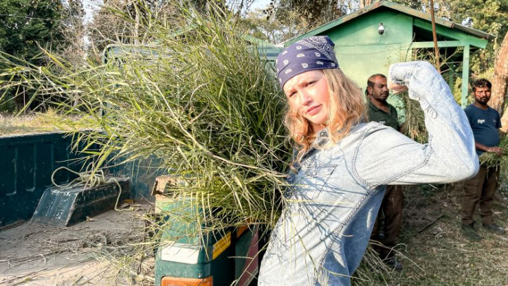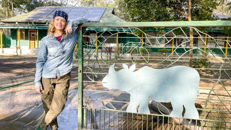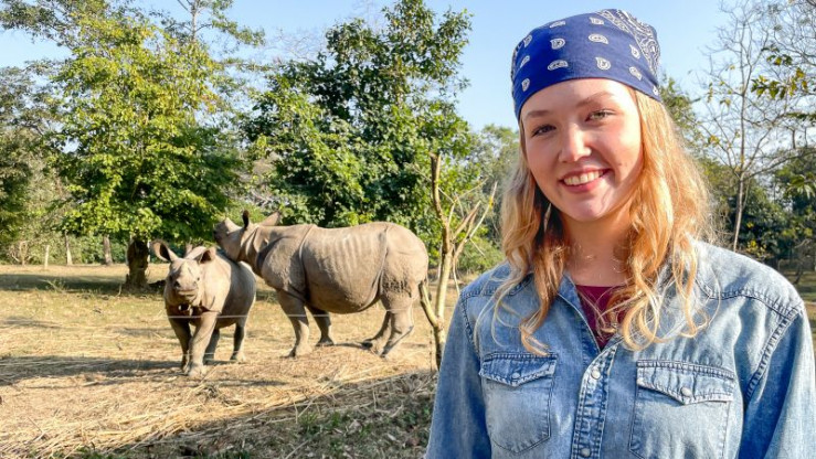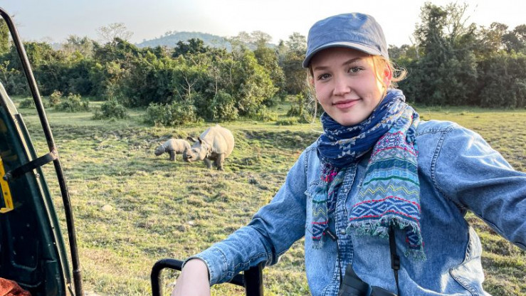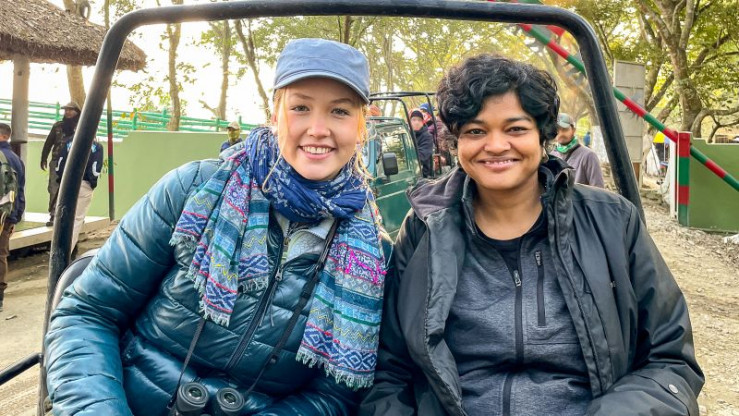Nina (links) besucht mit Artenschützerin Divya in Indien den Kaziranga Nationalpark. Hier leben einige der letzten Panzernashörner der Welt. (Divya Vasudev).
