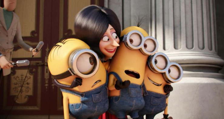Scarlett Overkill (2.v.l.) umarmt die Minions Stuart (l.), Kevin (2.v.r.) und Bob und gibt sich vor der Öffentlichkeit charmant, doch die skrupellose Superschurkin verfolgt in Wirklichkeit nur ihr eigenes Ziel...