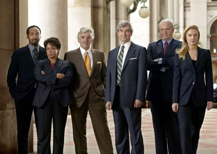 15. Staffel: Jessie Martin als Det. Ed Green, S. Epatha Merkerson als Lt. Anita Van Buren, Dennis Farina als Joe Fontana, Sam Waterston als Asst. D.A. Jack McCoy, Fred Thompson als D.A. Arthur Branch, Elisabeth Rohm als Asst. D.A. Serena Southerlyn (v.li.)