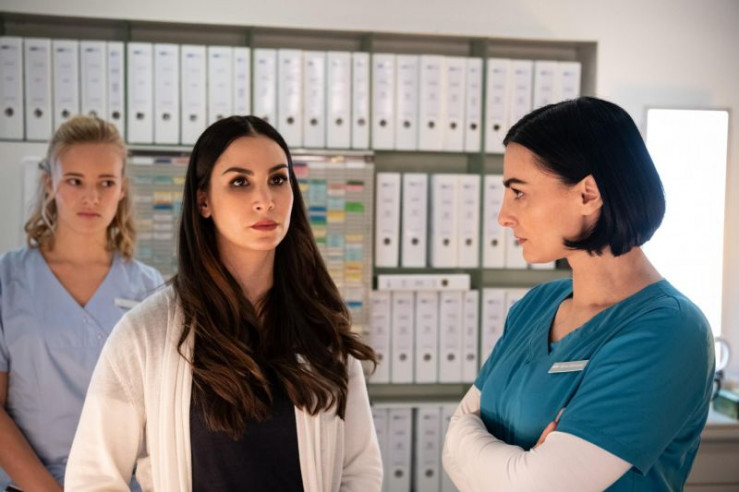Nora (Mimi Fielder, r.) stellt Samira (Sila Sahin-Radlinger, M.) und Schwesternschülerin Kiki (Valerie Huber) zur Rede.
