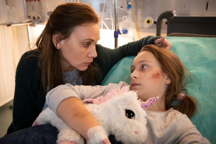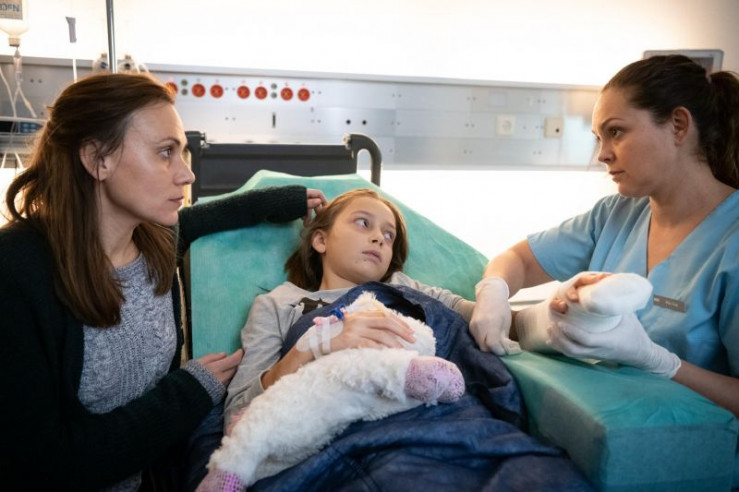Ella (Ines Quermann, r.) kümmert sich um Neles (Mascha Schrader, M.) verletzten Arm. Ihre Mutter Steffi (Mandy Rudski) ist besorgt.