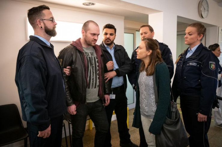 Steffis (Mandy Rudski, M.) Lebensgefährte Marcel (Patrick Heinrich, 2.v.l.) wird von Polizisten (Komparsen, 2.v.r. Oliver Clemens) vorläufig festgenommen. Der Verdacht der Kindesmisshandlung gegen ihn hat sich verhärtet.