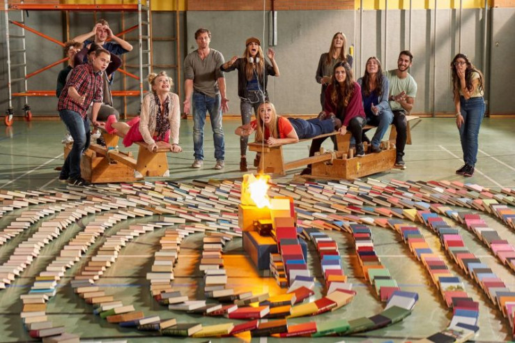 Stefan Vollmer (Hendrik Duryn, 8.v.r.) hat mit dem G-Kurs einen Versuch mit einem riesigen Aufbau einer "Kettenreaktion" in der Turnhalle geplant - doch die Aktion läuft anders als geplant...
