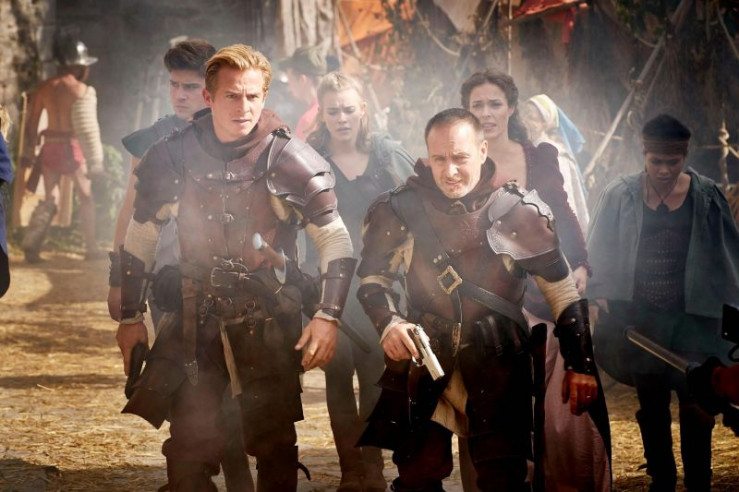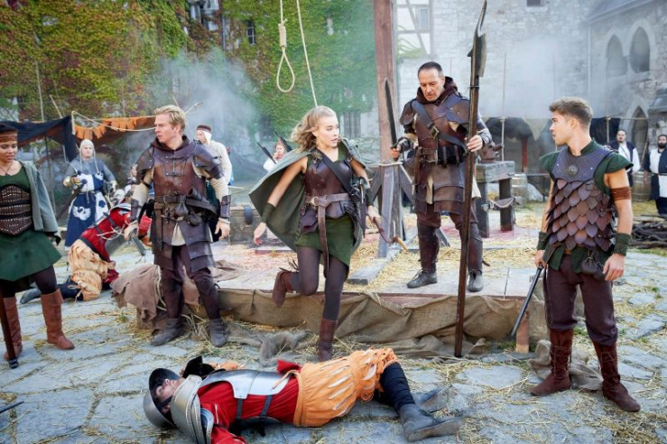 Kaum sind die Autobahnpolizisten Semir alias 'Semiron' (Erdogan Atalay, 2.v.r.) und Paul alias 'Paulus' (Daniel Roesner, l.) undercover auf einem Fantasy-Rollenspiel-Gelände angekommen werden sie in eine Schwertkampf verwickelt. Welch glückliche Fügung, dass die Elbe Gwindil (Milena Tscharntke) mit ihrem Bogen die Situation klären kann.