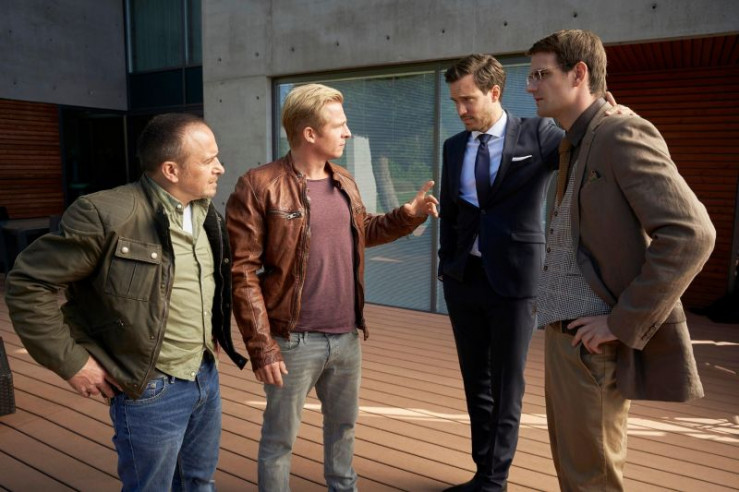 Semir (Erdogan Atalay, l.) und Paul (Daniel Roesner, 2.v.l.) befragen den Wissenschaftler Dr. Janik Sydow (Marian Kindermann, r.) nach Pauls Vater als Sydows Halbbruder Klemens Kronbach (Tobias von Dieken) dazu stößt, das Gespräch unterbricht und Sydow von den Polizisten wegführt.