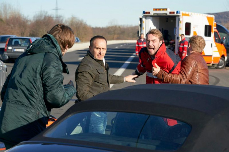 Das Unfallopfer Isabell ist schwer verletzt, der Sanitäter Moritz (Max Woelky, 2.v.r) ist entsetzt von der Gleichgültigkeit des Rasers. Semir (Erdogan Atalay, 2.v.l.) und Paul (Daniel Roesner, r.) verhören Boris (Joseph Bundschuh), als Moritz plötzlich auf ihn losgeht.