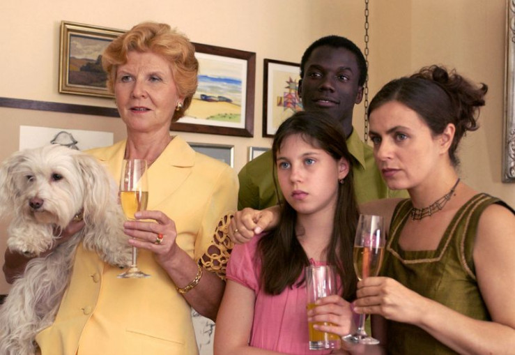 Etwas irritiert beobachten Tante Hildegard (Irm Herrmann, links), Anna (Naomi Krauss, rechts) mit Tochter Jule (Valea-Katharina Scalabrino) und Mbele (Morgan Domingos) das Treiben der Party.