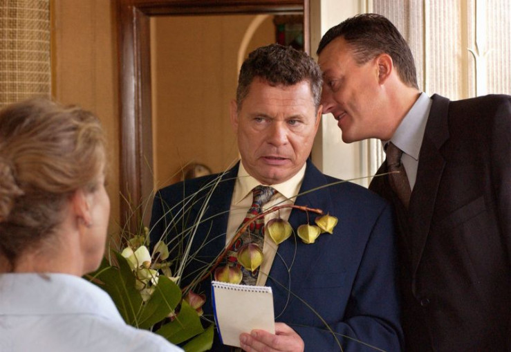 Der Bürgermeister (Roland Nitschke, Mitte) kommt, um Vera (Gudrun Landgrebe) zum Geburtstag zu gratulieren.
