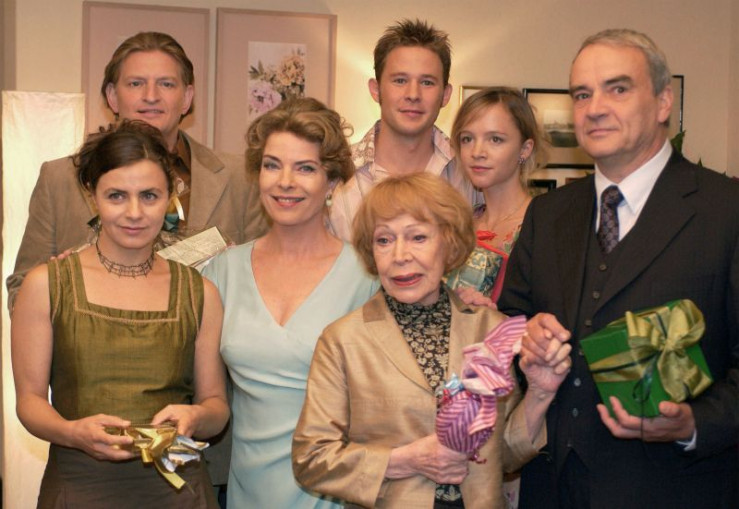 Eine schrecklich nette Familie: Vera (Gudrun Landgrebe, 3. von links), ihr Mann Werner (Walter Kleye, rechts), ihre Mutter Charlotte (Gisela Trowe, Mitte), ihre Kinder Anna (Naomi Krauss, links), Philipp (Oliver Clemens, hinten Mitte) und Christa (Johanna Klante, 2. von rechts), sowie ihr Schwiegersohn Sven (Frank Kessler, 2. von links).