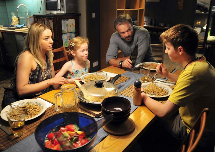 Vivi (Bella Bading, 2. von links) und Vincent (Matti Schmidt-Schaller, rechts) finden es witzig, dass Wanda (Karolina Lodyga, links) chinesisches Essen bestellt hat, weil sie nicht kochen kann. Karlheinz (Hannes Jaenicke) findet das überhaupt nicht lustig.