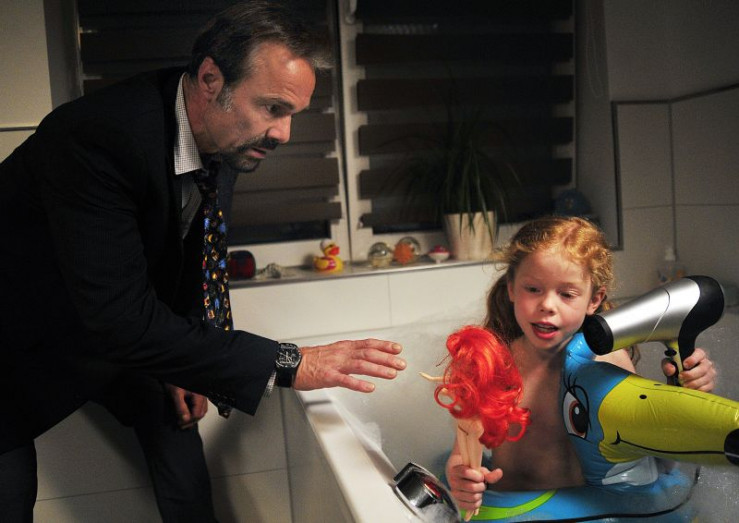 Karlheinz (Hannes Jaenicke) ist geschockt, denn seine Tochter Vivi (Bella Bading) spielt mit dem Föhn in der Badewanne.