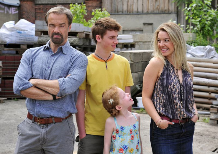 Karlheinz (Hannes Jaenicke, links) mit seinen Kindern Vincent (Matti Schmidt-Schaller) und Vivi (Bella Bading) und ihrem neuen Kindermädchen Wanda (Karolina Lodyga, rechts).