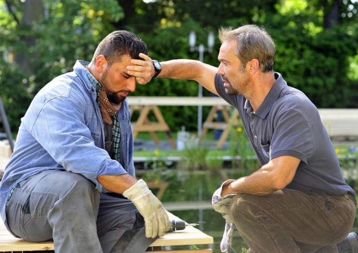 Der finanziell angeschlagene Bauunternehmer Karlheinz (Hannes Jaenicke, Mitte) will seine beiden Angestellten Ronny (Andreas Guenther, links) und Hakan (Michael Keseroglu) nur ungern entlassen.