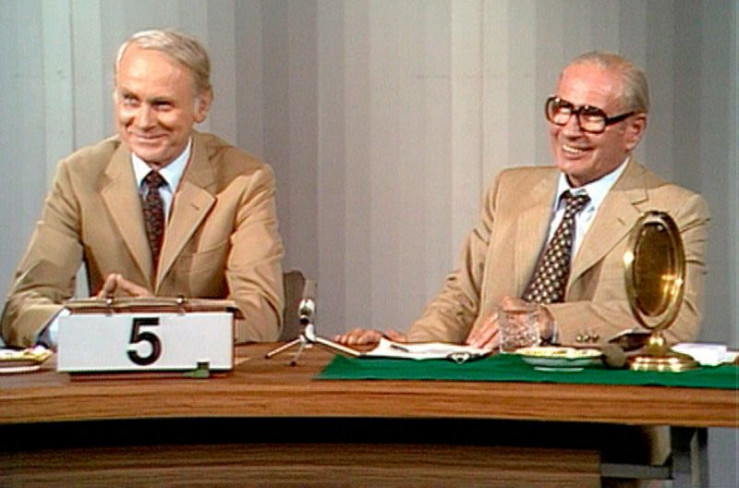 Robert Lembke (rechts) als Quizmaster der Sendung "Was bin ich?". Zu Gast: Loriot.