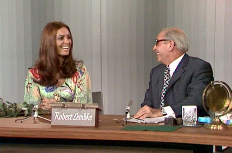 Robert Lembke (rechts) als Quizmaster der Sendung "Was bin ich?". Zu Gast: die Sängerin Daliah Lavi.