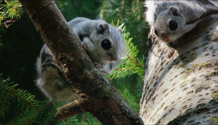 Merkwürdig erscheint es, wenn sich Gleithörnchen um die Gunst eines Weibchens bemühen. Nachdem ein Weibchen einen Baum mit Kot markiert hat, treffen "wie im Flug" die ersten Verehrer ein. Dank ihrer Flughaut können die Nager relativ große Distanzen überwinden. Verlassene Spechthöhlen sind nicht nur bei Gleithörnchen beliebt. Auch Schellenten nutzen sie, um darin ihre Küken auszubrüten. Schon kurz nach dem Schlupf lockt die Mutter ihren Nachwuchs ins Freie. Erstmals aus sechs Kamera-Perspektiven und in der Wildnis gedreht, ist der Absprung der flugunfähigen Kleinen in die Tiefe zu sehen.