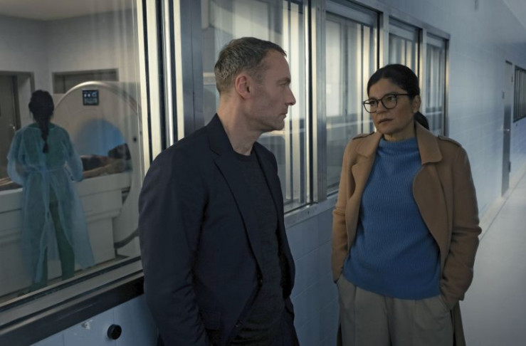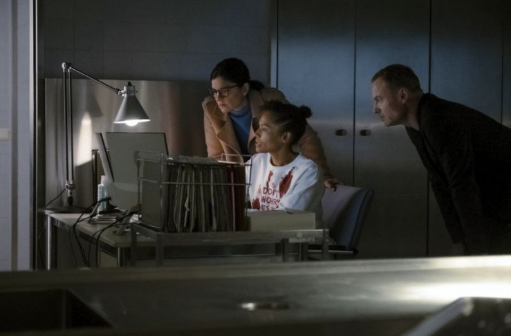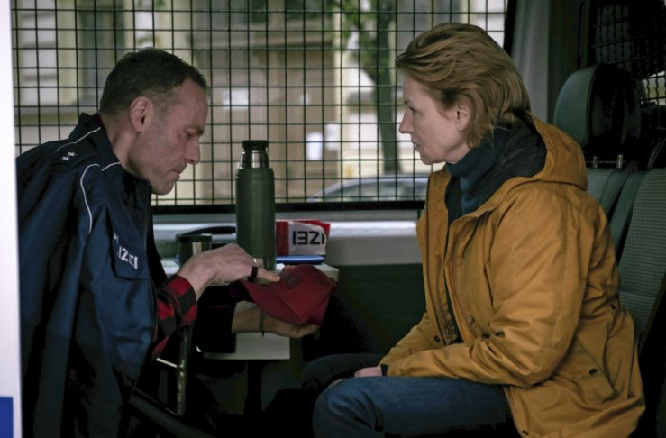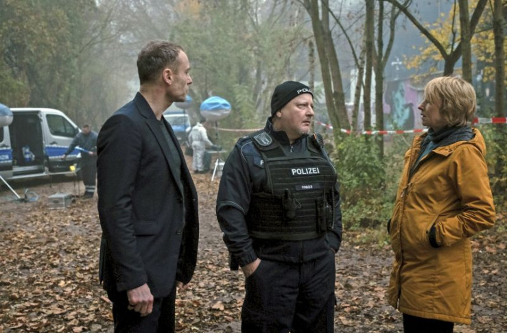 Susanne Bonard (Corinna Harfouch, re.) und Robert Karow (Mark Waschke, li.) werten die Spuren am Tatort aus, wo der tote Obdachlose im Wald entdeckt wurde.