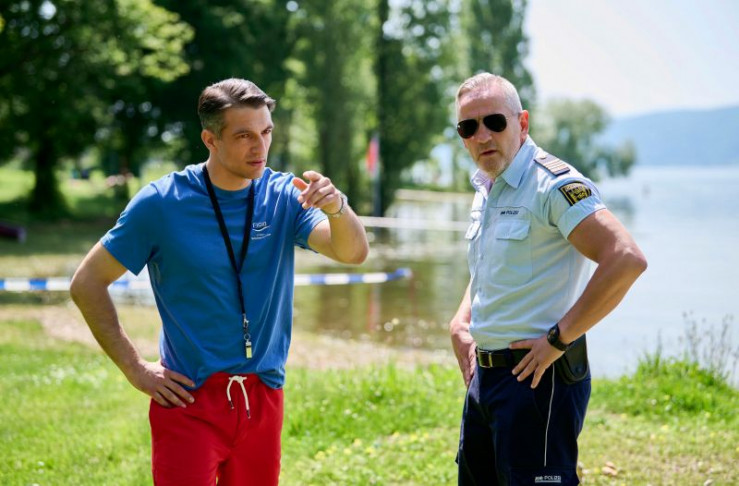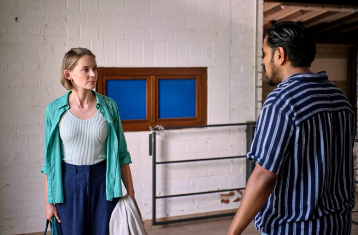 Lara Kastner (Nadja Bobyleva, l.) und Tobias Lehner (Richard Manualpillai, r.) treffen auf dem Parkplatz des Strandbades aufeinander.