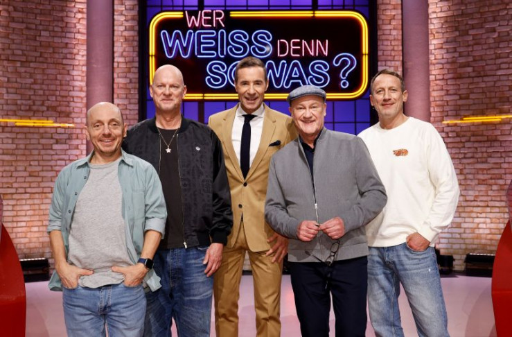 Moderator Kai Pflaume (M.) und seine Rateteam-Kapitäne Bernhard Hoëcker (l.) und Wotan Wilke Möhring (r.) begrüßen in dieser Sendung, den Kabarettist und Musiker, Rüdiger Hoffmann (2.v.l.) und den Radiomoderator und Komiker, Bodo Bach (Robert Treutel, 2.v.r.).