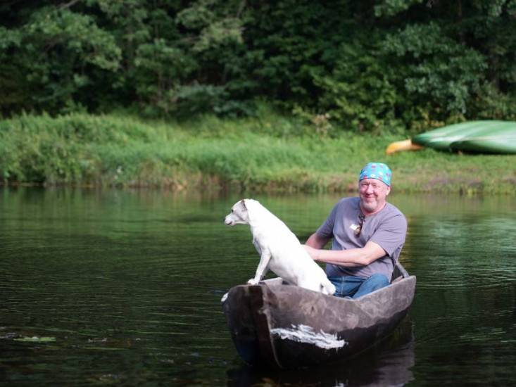 Ein Mann, ein Boot, ein Einbaumboot: Aivar Ruukel mit Hund Pitsu im Soomaa-Nationalpark.