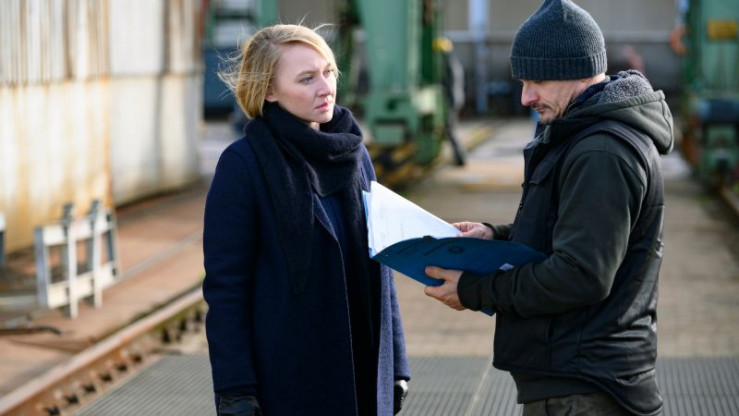 Nora Weiss (Anna Maria Mühe) zielt auf Maik Jansen (Mirco Kreibich), als er versucht, Tim (Enno Hoppe) als Geisel zu nehmen.