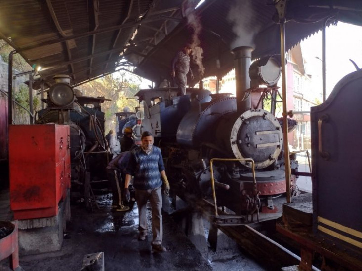 Vor ihrer ersten Fahrt des Tages machen Mechaniker die Dampflokomotive der DHR startklar. Die kurze Strecke von Darjeeling nach Ghum ist bei Touristen sehr beliebt.