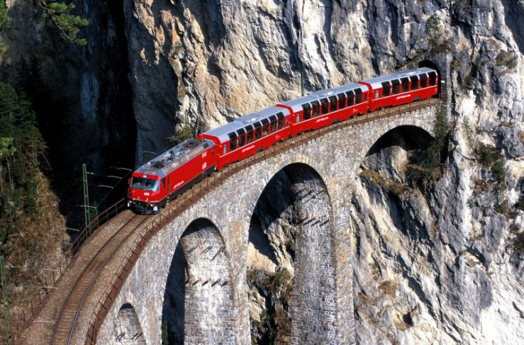 Über 196 Brücken und durch 55 Tunnel kämpft sich der Zug. Die Strecke führt durch tiefe Täler, wilde Schluchten und über das ewige Eis der Bündner Alpen. Erst 1890 erschlossen Bahningenieure den Südosten der Schweiz. Die einzigartige und gewagte Streckenführung durch das Albulatal und über den Berninapass zählt seit dem Jahr 2008 zum UNESCO-Welterbe.