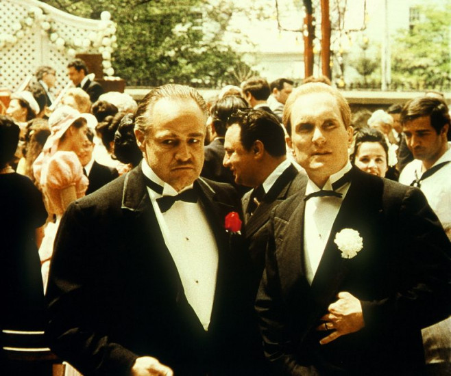 Der Pate Don Vito Corleone (Marlon Brando, l.) und sein Berater Tom Hagen (Robert Duvall. r) wälzen auch bei der Hochzeit von Vitos Tochter Probleme.