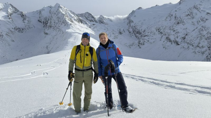 SWR-Moderator Johannes Zenglein (links) reist ins Ötztal und möchte herausfinden, wie ein Skiurlaub rund um Sölden günstig gestaltet werden kann und was man außer Pistenspaß dort noch erleben kann. Hier mit Bergführer Paul Walser bei der Schneeschuhwanderung.