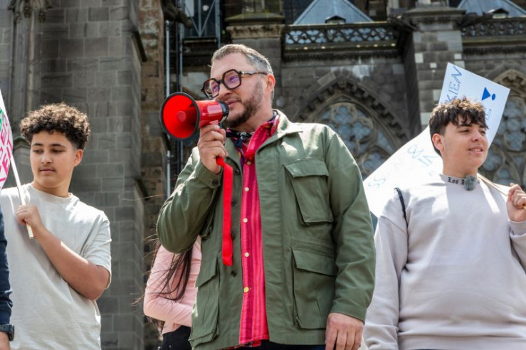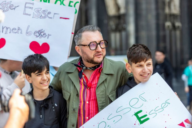 Schülerinnen und Schüler der Katharina-Henoth-Gesamtschule bei einer Unterschriftenaktion im Rahmen des Formats "besseresser goes Schule - Lege packt's an" vor dem Kölner Dom.