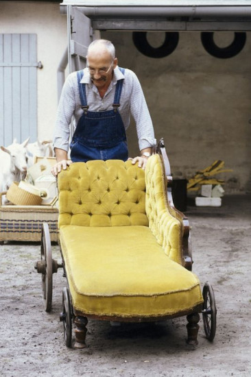 Peter (Peter Lustig) hat ein schönes, altes Sofa geschenkt bekommen. Um es besser transportieren zu können, legt er es auf zwei Achsen mit Rädern.