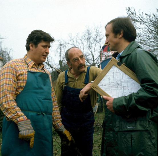 Peter Lustig (M.) und sein Nachbar (Helmut Krauss, l.) streiten sich: Wo verläuft die Grenze zwischen ihren Grundstücken? Und wo lässt sich der Zaun setzen?