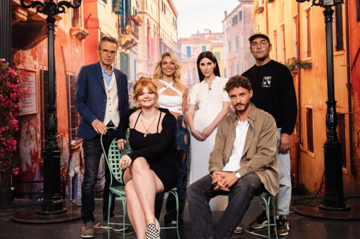 Sophie Passmann (2.v.r.) und Tommi Schmitt (2.v.l.) in ihrer ZDFneo-Sendung "Neo Ragazzi" mit Uwe Baltner (3.v.l.), Lola Weippert (l.), Dr. Emi (3.v.r.) und Bosse (l.)