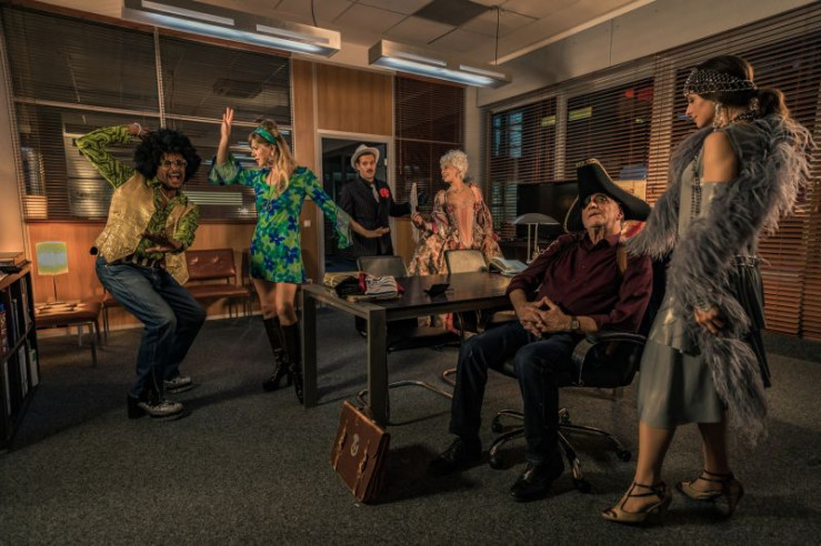 Die SOKOs sind bereit für den Münchner Polizeiball: Franz Ainfahnur (Christofer v. Beau, l.), Resi Schwaiger (Mersiha Husagic, 2.v.l.), Dominik Morgenstern (Joscha Kiefer, 3.v.l.), Kriminaldirektorin Kreiner (Ilona Grübel, 3.v.r.), Arthur Bauer (Gerd Silberbauer, 2.v.r.) und Katharina Hahn (Bianca Hein, r.).