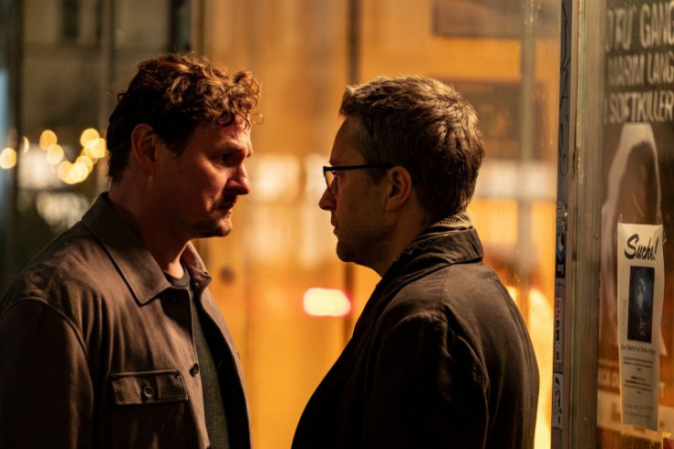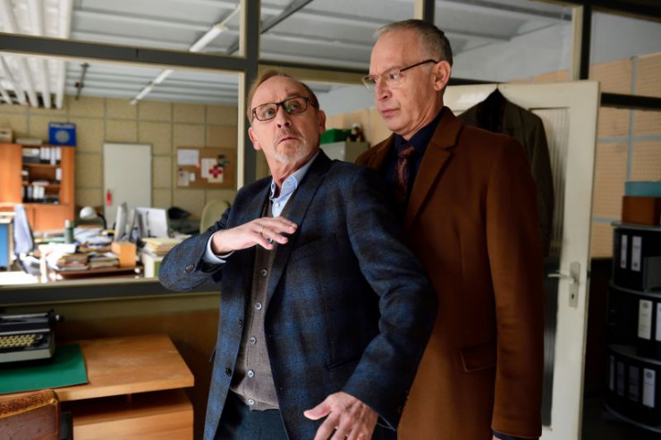 Staatsanwalt Lukas Benedikt (Thomas Loibl, r.) und der Chef des Kommissar-Trios Helmut Zangel (Christoph Süß, l.) kennen sich gut und begegnen sich im Justizpalast. Ein Fall des Kommissar-Trios wurde gerade verhandelt. Der Fall ist jetzt abgeschlossen. Staatsanwalt Benedikt und Zangel sind damit sehr zufrieden.