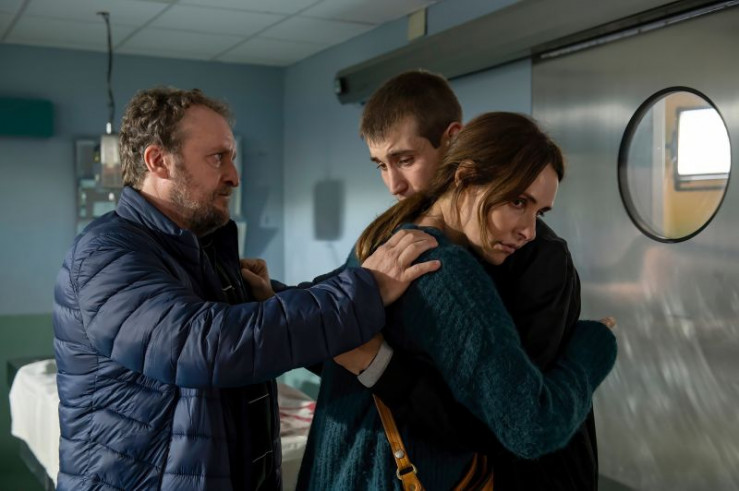 Santiagos Frau Laura (Patricia Vico, M.), sein Sohn Raúl (Lucas Nabor, r.) und sein Freund und Kollege Ramón Fernando Cayo, l.) sind schwer mitgenommen von dem zunächst spurlosen Verschwinden des Taxifahrers.