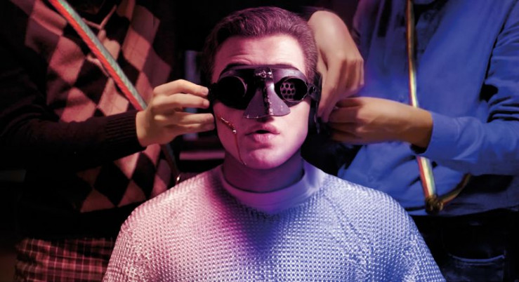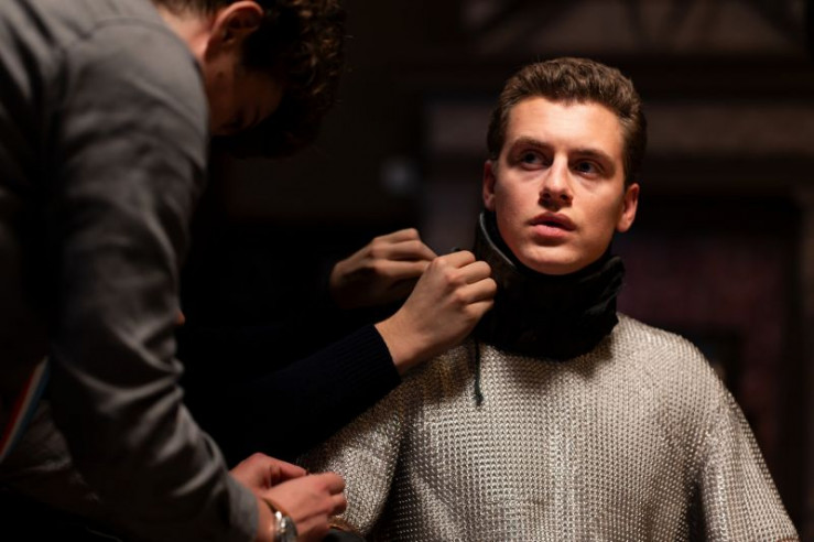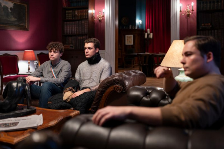 Timo (Michael Schweisser, l.) und Sven (Kasimir Pretzschner, 2.v.l.) bereiten Adem (Valon Krasniqi, r.) auf sein Pauk-Training vor, während Vincent einen Vortrag über die Tradition des akademischen Fechtens hält.