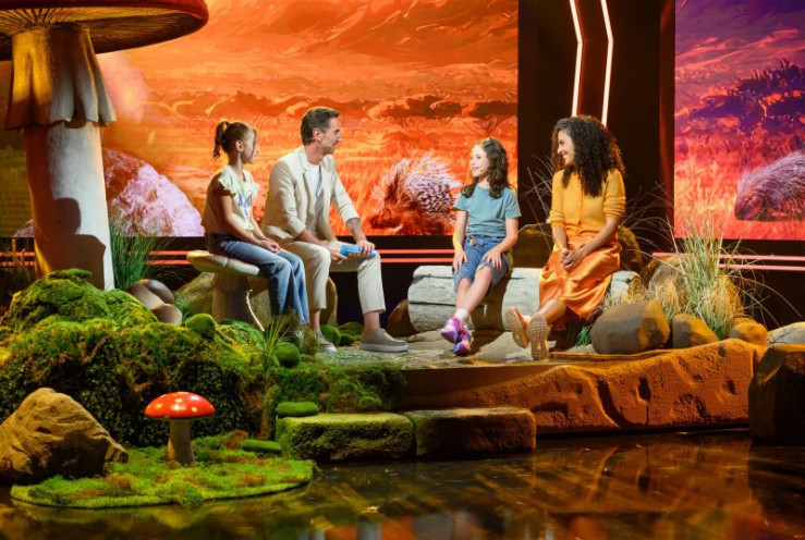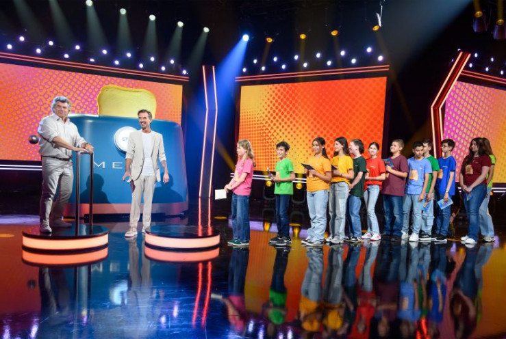 Kinder fragen, Erwachsene staunen: v.l.n.r. Fragenkinder Josefa, acht Jahre alt, und Lola (9) mit Moderator Florian Silbereisen und Maus-Expertin Siham El-Maimouni. Die Kinder fragen, "Wer kann schneller laufen, ein Igel oder ein Stachelschwein?"