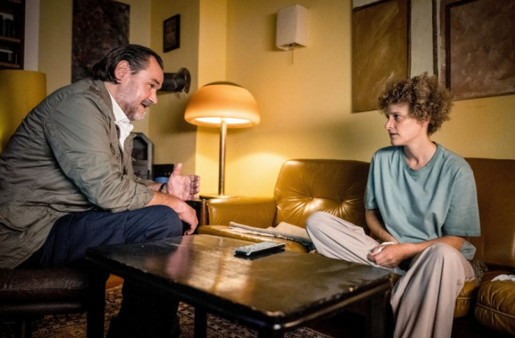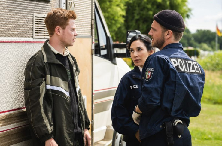 Frank (Niklas Osterloh, r.) und Arda (Yasemin Cetinkaya, M.) findet nichts Verdächtiges bei Sandro (Leon Seidel, l.).