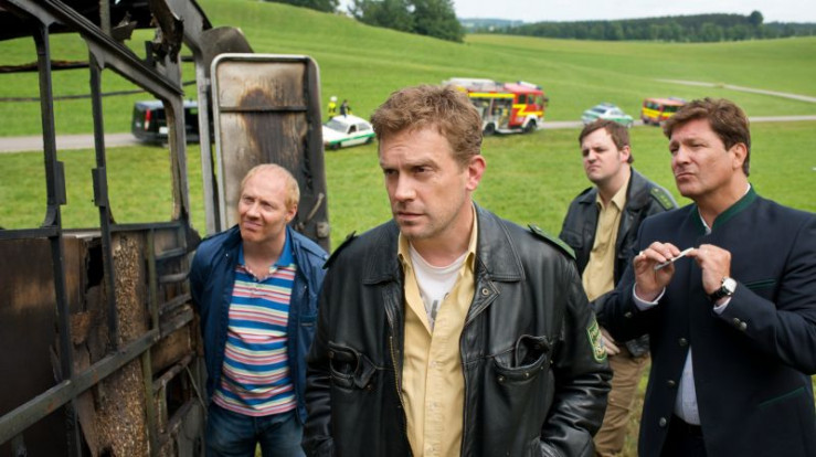 Dorfpolizist Franz Eberhofer (Sebastian Bezzel, 2. v. li.) und sein Freund Rudi Birkenberger (Simon Schwarz) glauben im Gegenzu zu Franz' Vorgesetzter Barschl (Francis Fulton-Smith, re.) nicht an einen Unfall.