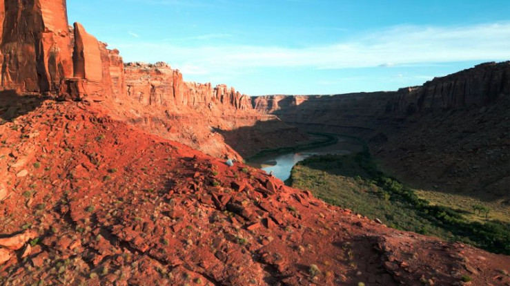 Abenteurer Samuel Häde in der Wildnis Amerikas mit Blick auf den Green River in Utah.