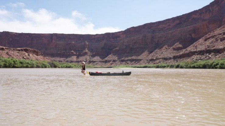 Auch mit dem Boot geht es manchmal nur zu Fuß. Samuel muss sein Kanu durch die flachen Stellen des Green Rivers ziehen.