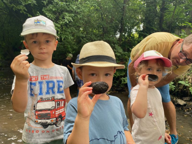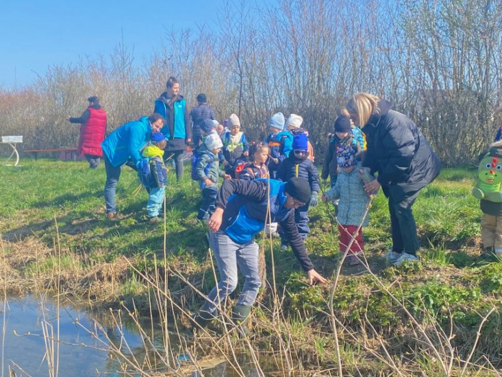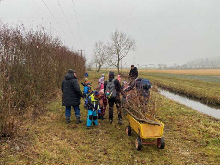 Kindergartenkinder setzen Weidenstecklinge am Ufer der Leibi, Holzheim, Lkr. Neu-Ulm, April 2025.