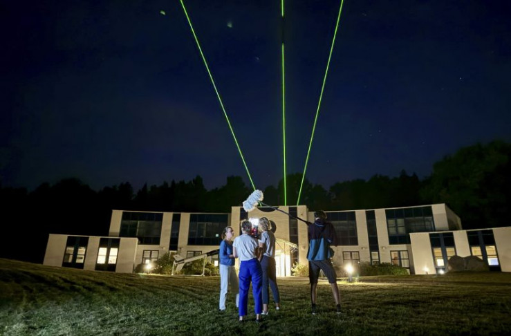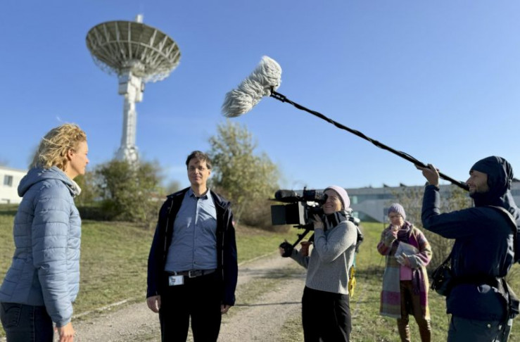 Das Filmteam und Presenterin Lena Ganschow im Gespräch mit Dr. Jens Berdermann am Deutschen Zentrum für Luft -und Raumfahrt in Neustrelitz.
