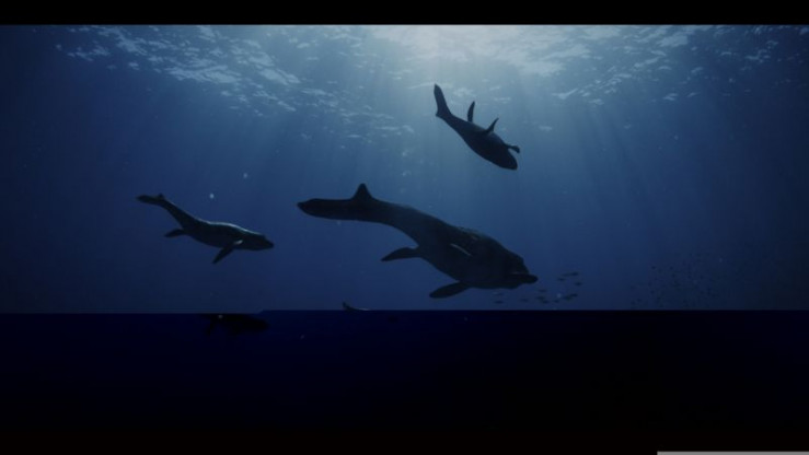 Der Mosasaurus, ein gigantischer Jäger der Kreidezeit, mit seinen Jungen. Im Laufe der Evolution gingen seine Vorfahren vom gefährlichen Festland zurück ins Wasser und verbreiteten sich über alle Weltmeere.