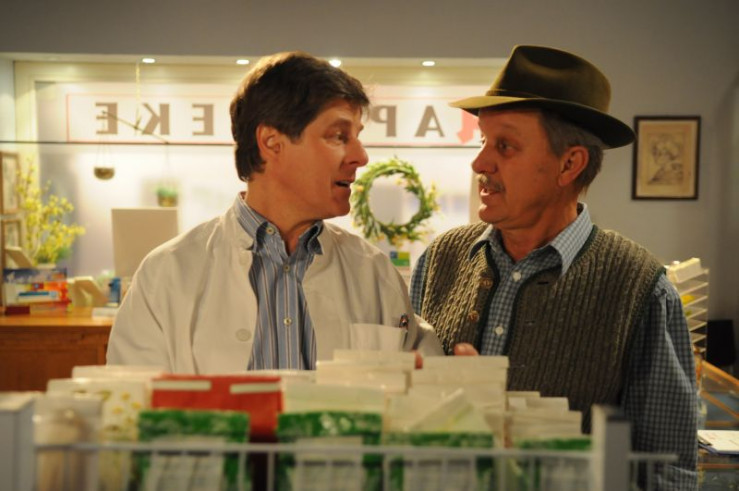 Joseph will nicht, dass Uschi sich beim Kellnern übernimmt. Von links: Joseph Brunner (Wilhelm Manske), Gregor Brunner (Holger M. Wilhelm) und Uschi Guggenmoser (Silke Popp).