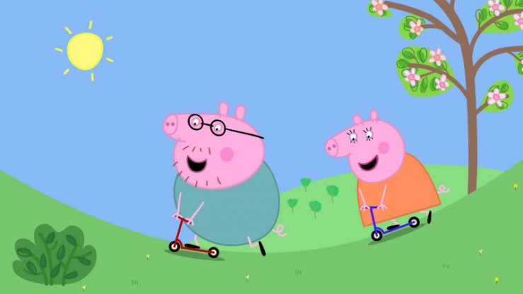 Peppa und Schorsch fahren gerne Roller. Nur Papa Wutz tut sich schwer damit.