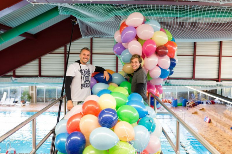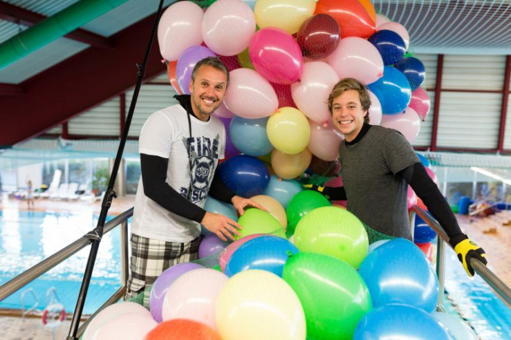 Tobi muss im Schwimmbad von einem fünf Meter Turm springen. Normalerweise dauert ein Sprung etwa eine Sekunde. Matthias will, dass Tobis Sprung, eineinhalb Sekunden dauert. Der Checker muss also die Physik austricksen und langsamer fallen. Aber wie?