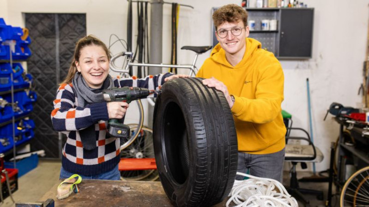 Marina und Tobi bauen gemeinsam eine Reifenschaukel aus einem alten Autoreifen.